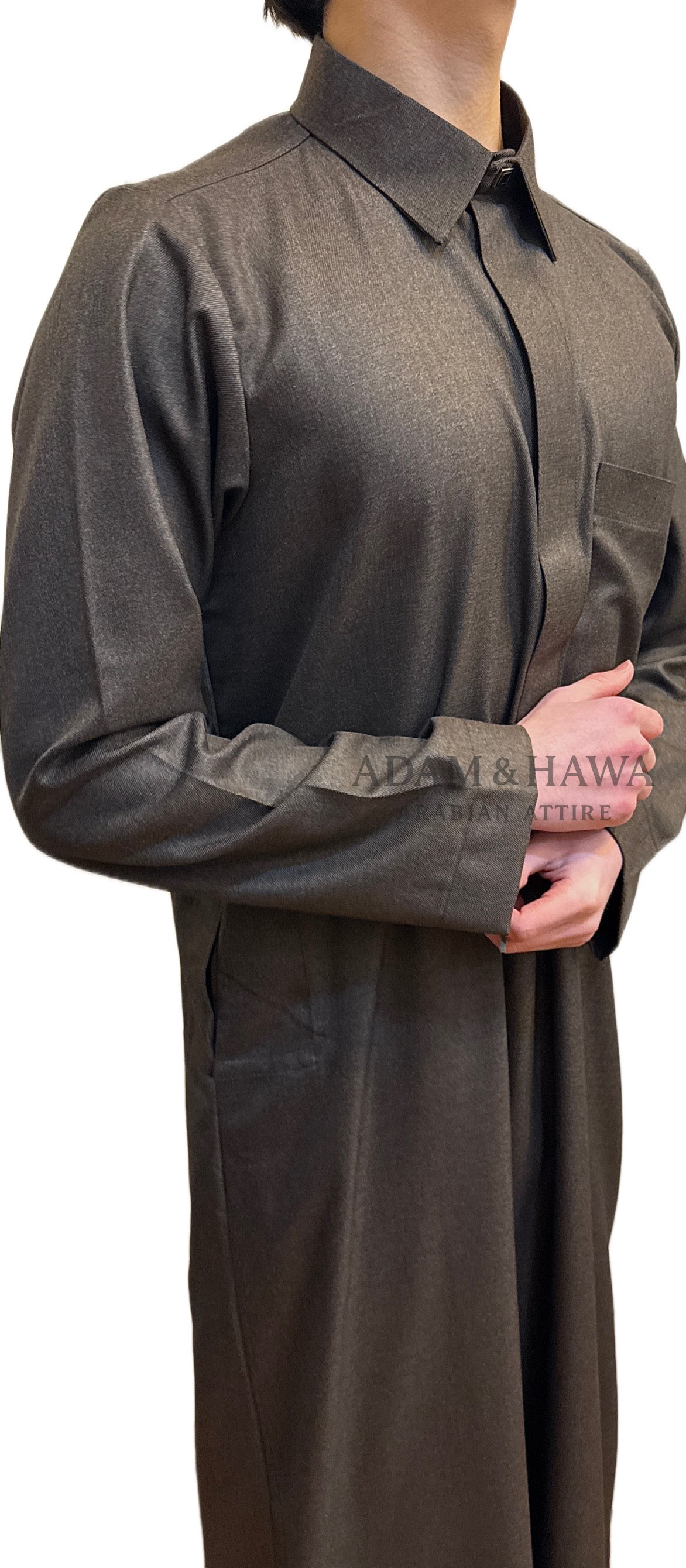 This Qatari style Thobe is perfect for winter for its thick lining of material used. The thobe has a sharp, refined look with a clean and modern silhouette. Designed in a deep charcoal black tone, it features a sleek zip-front closure for effortless wear and a clasped buttoned neck for a finish that adds a subtle touch of sophistication. Thoughtfully designed for practicality, it includes two discreet side pockets and a chest pocket, combining everyday function with a premium aesthetic. This Thobe delivers timeless Qatari look with a polished modern finish.
