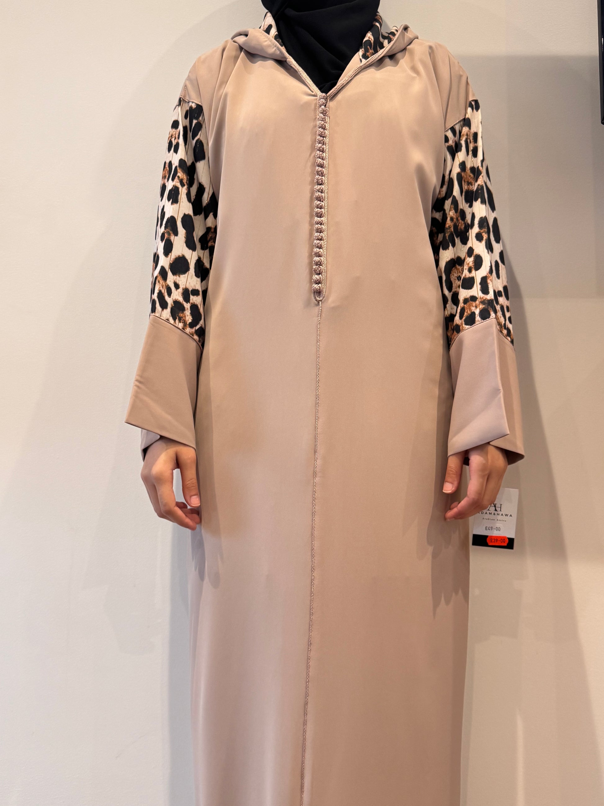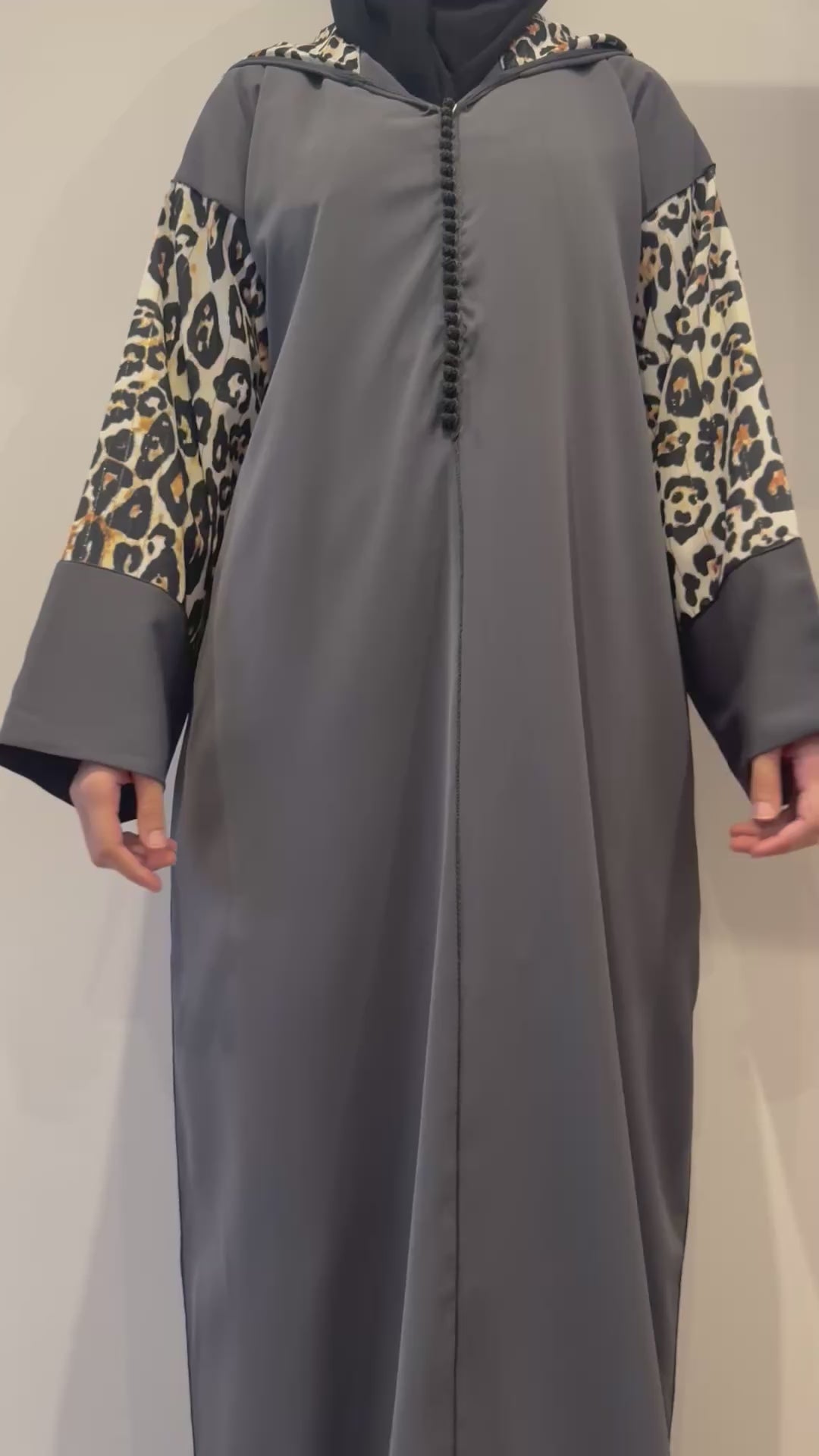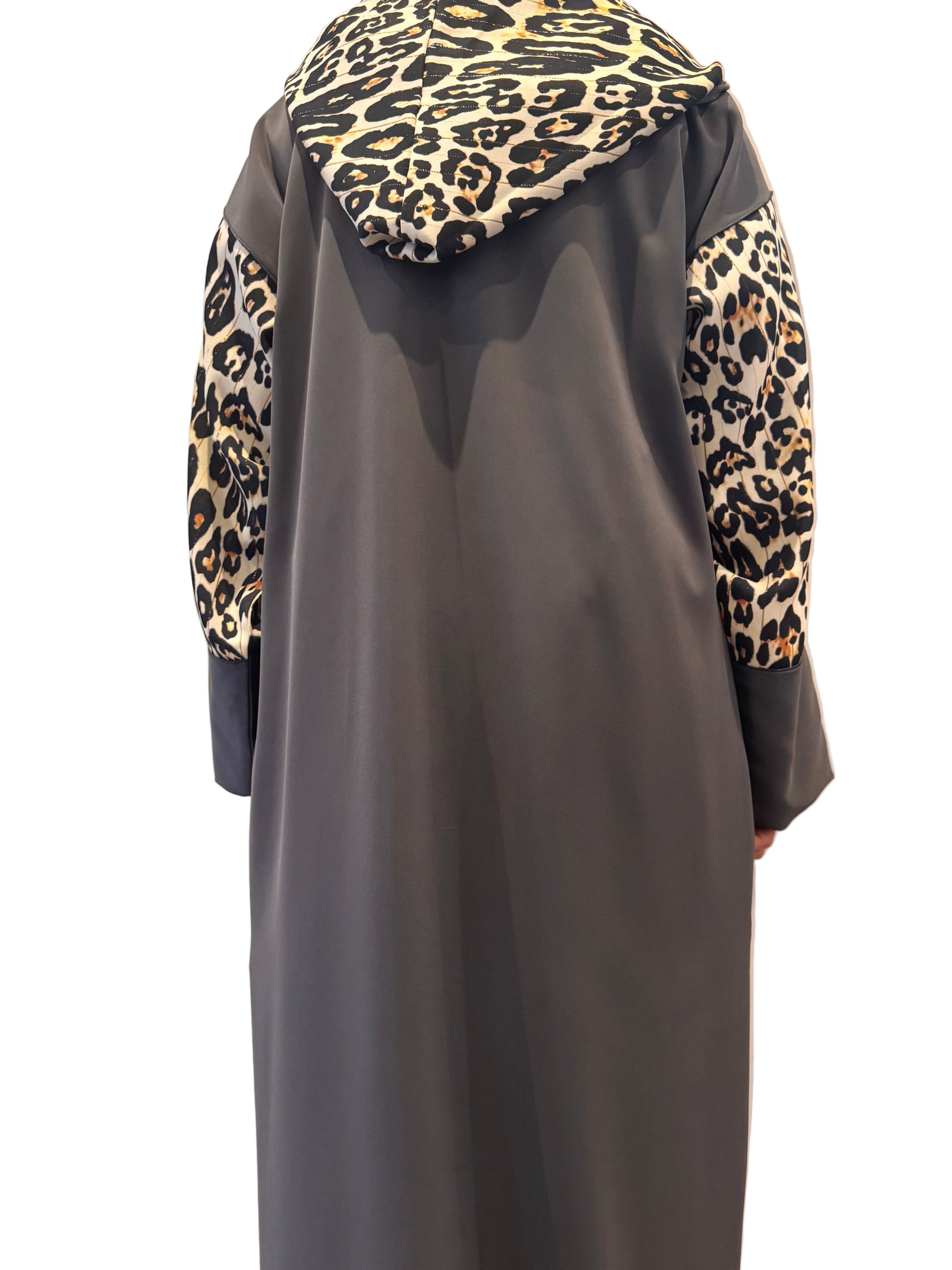 This is a contemporary take on the traditional Moroccan Jellaba (or Jalabiya). Crafted in a beautiful fabric, this long, loose-fitting piece is modernized with striking leopard print on the full sleeves and the inner lining of the signature pointed hood (Qob). It features traditional finishing details, such as a delicate braiding or frogging/beading down the front placket, blending cultural heritage with a modern, dramatic flair.